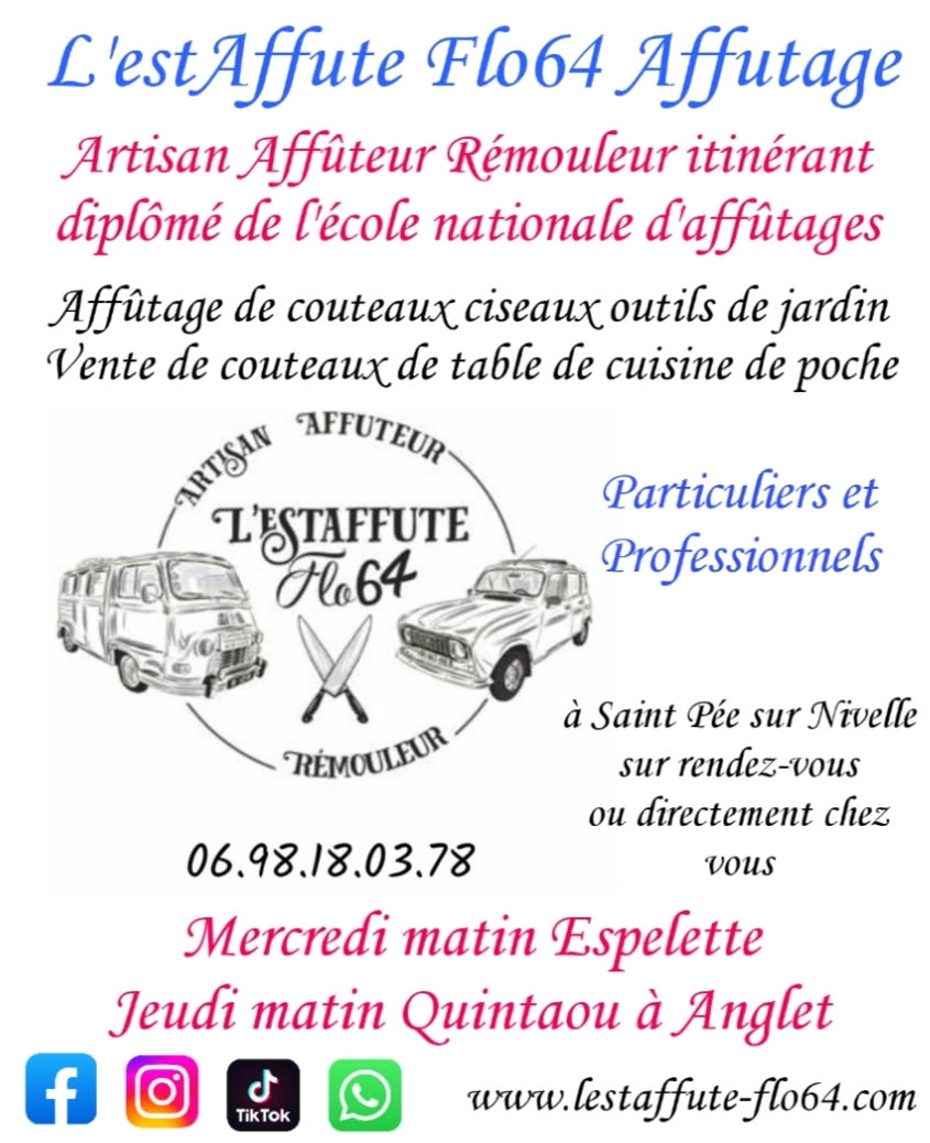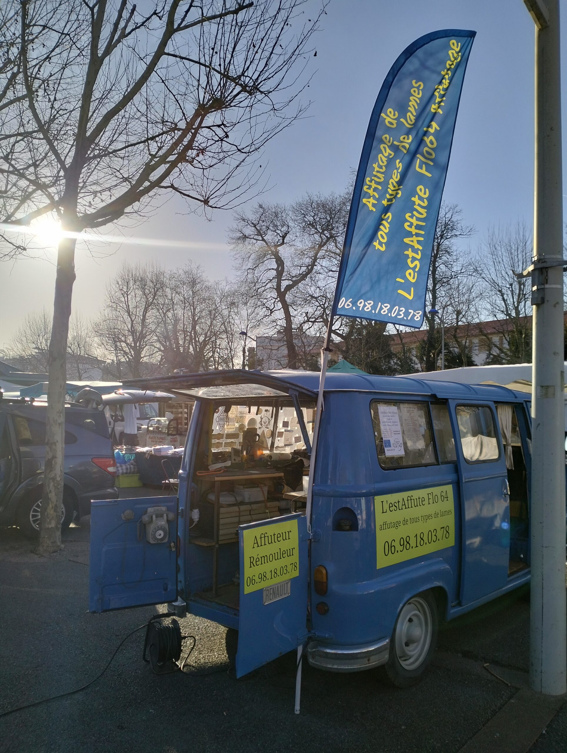 Artisan affûteur rémouleur itinérant, Florent martin affûte divers et variés (couteaux bien sûr mais aussi ciseaux de coiffure, de couture, tous les outils de jardin : sécateur, taille haie, chaine de tronçonneuse, lame de tondeuse, scie circulaire, foret etc…). Retrouvez moi sur de nombreux marchés du Pays Basque ainsi que certaines festivités.